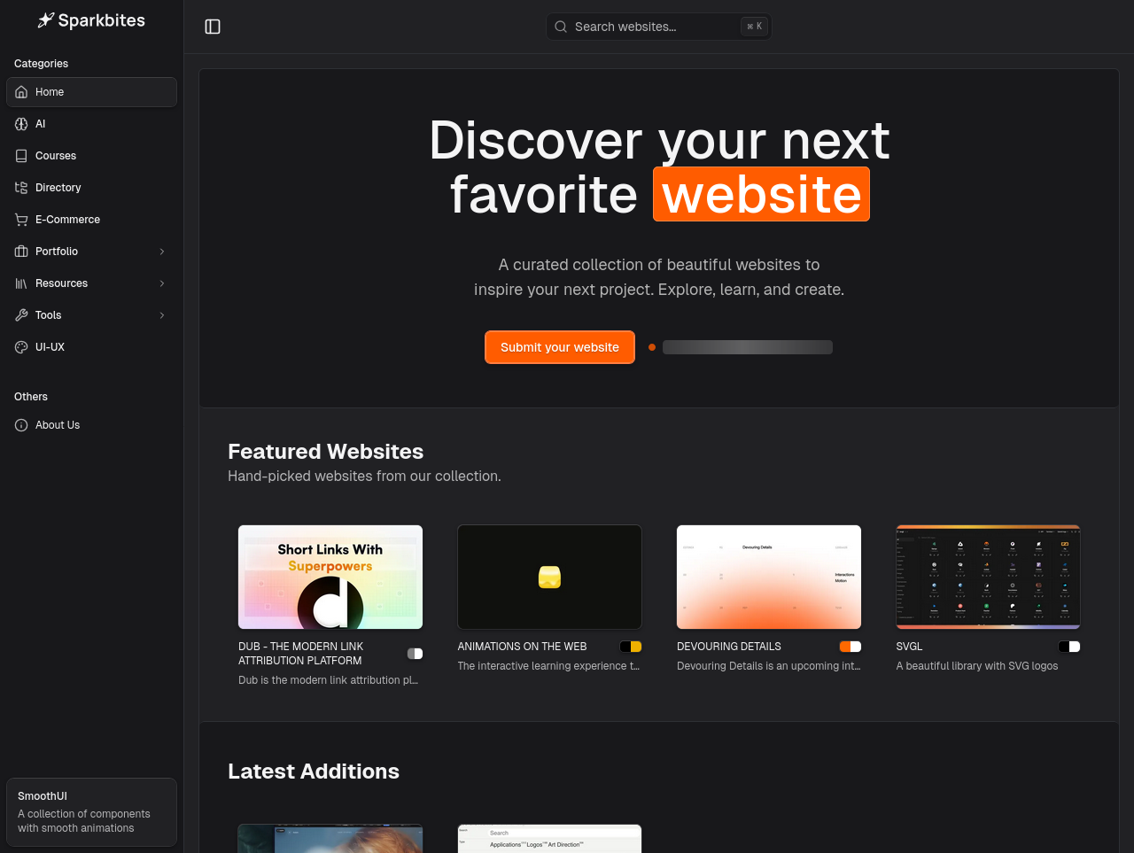 SparkBites is a curated directory of innovative web design inspiration, built to help designers, developers, and creatives break through creative blocks and discover fresh ideas.